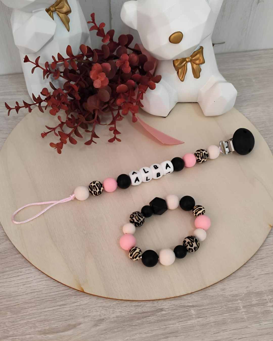 Pack leopardo rosa es un pequeño universo de dulzura creado para acompañar los primeros momentos de un bebé con amor, color y fantasía. Dentro de este pack encontraras , un chupetero que abraza con suavidad y un mordedor personalizado con su nombre con estampado de leopardo susurrar belleza y ternura.