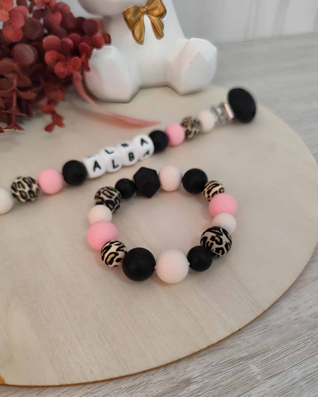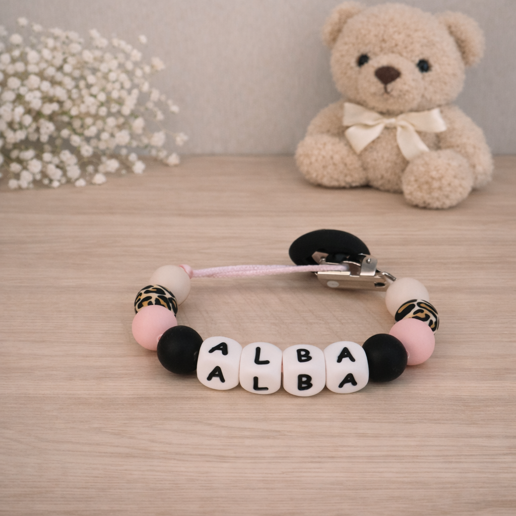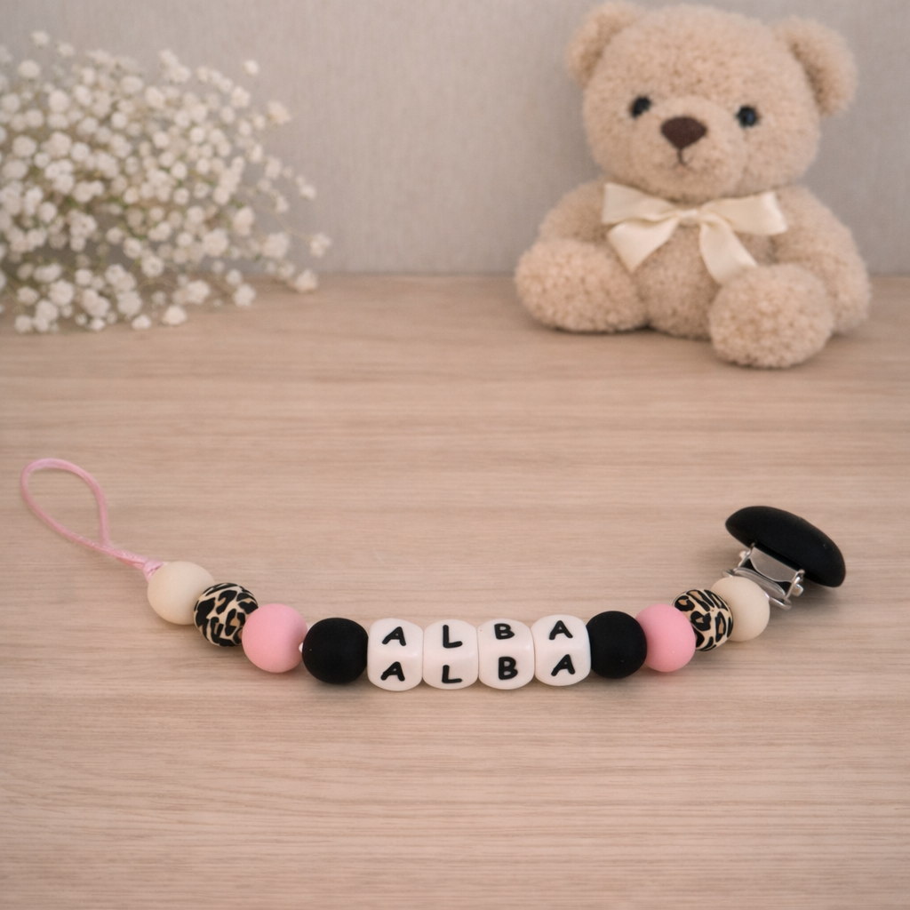 - Chupetero leopardo: hecho a mano con materiales seguros para bebés, con diseño de leopardo y opción de personalización con el nombre del pequeño. Ayuda a mantener el chupete siempre a mano, evitando caídas y pérdidas.
