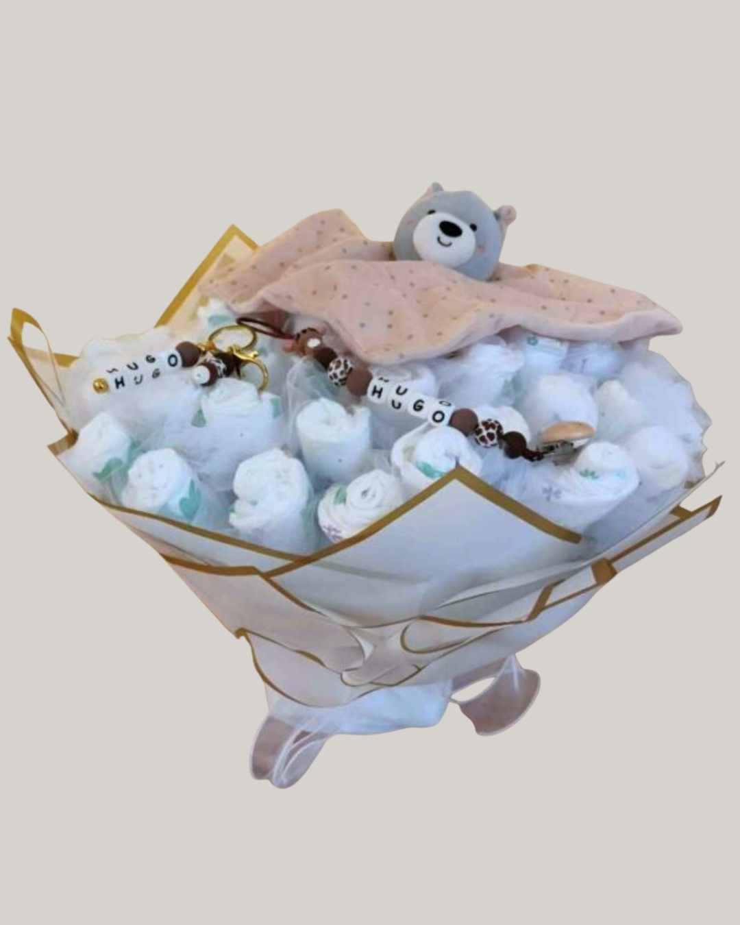 - Este ramo es mucho más que pañales: es una forma de decir “bienvenido” con ternura, estilo y un toque personal que lo convierte en un recuerdo para toda la vida.