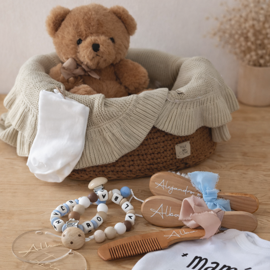 Diseñada con mimo y pensada para emocionar, esta canastilla reúne todos esos detalles que hacen que un nacimiento sea aún más especial. Cada pieza está personalizada con el nombre del bebé y presentada con una delicadeza que enamora.